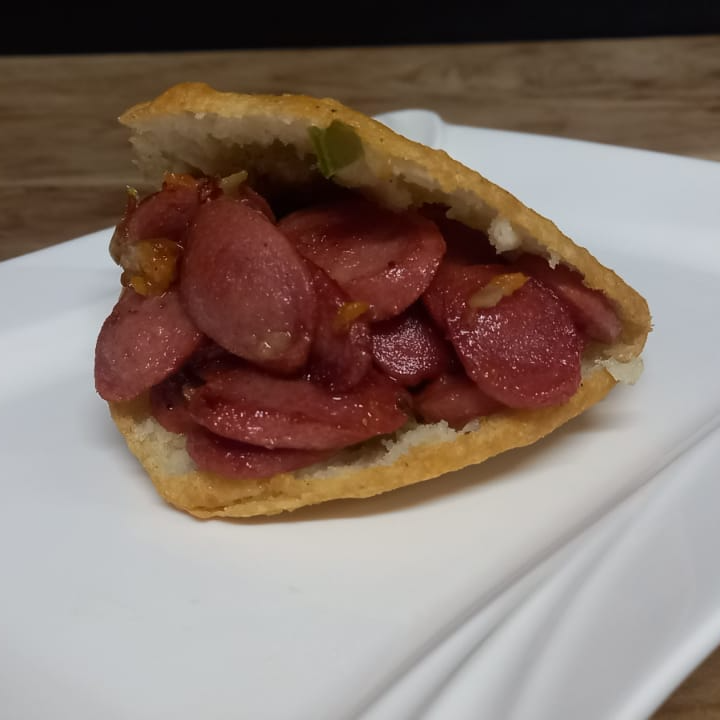 Arepa rellena con salchichas salteadas con aliños varios. Puedes acompañarla con la salsa de la casa de manera adicional.