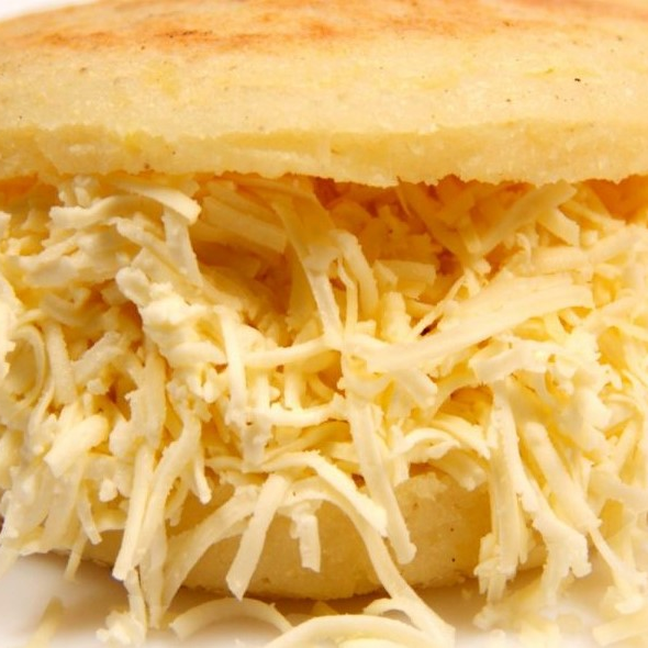 Arepa de harina de maíz precocida rellena de queso blanco y queso cheddar. Puedes acompañarla con la salsa de la casa de manera adicional.
