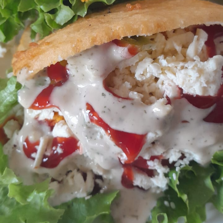 Arepa de harina de maíz precocida frita, rellena de lechuga, tomate, pollo, queso blanco, salsa de tomate y salsa de la casa.