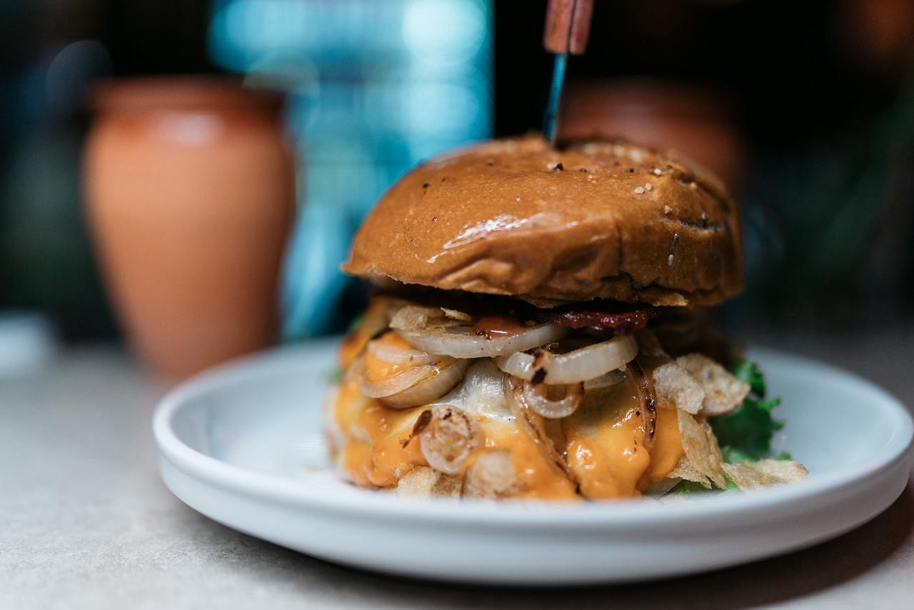 Chipotle, torta angus media libra, cebolla caramelizada, queso mozzarella, queso cheddar, queso suizo, provolone, bacon, salsa BBQ, mayonesa casera. Incluye papas tostadas.