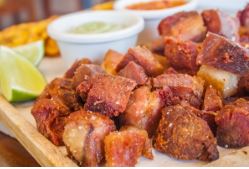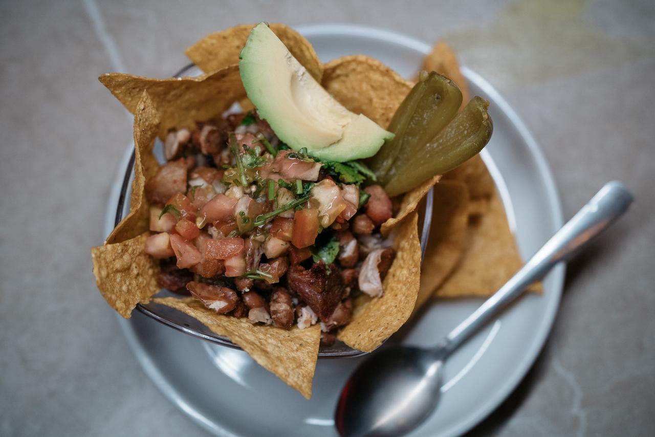 Delicioso chifrijo, arroz, frijoles, pico de gallo, tomate picado con limón, cilantro, cebolla, tortillas con proteína a escoger.