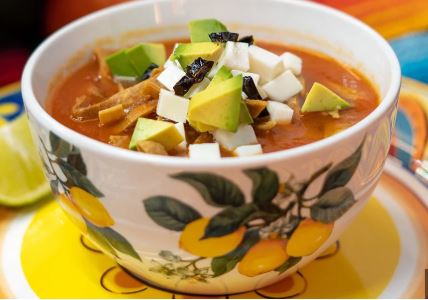 Deliciosa sopa azteca, elaborada a base de tomate natural, acompañada de aguacate, queso mozzarella.