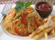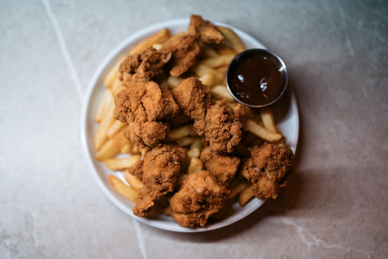 Delicioso nugguets de pollo con papas fritas, delicioso dedos de pescado con papas fritas, deliciosos dedos de pollo con papas.