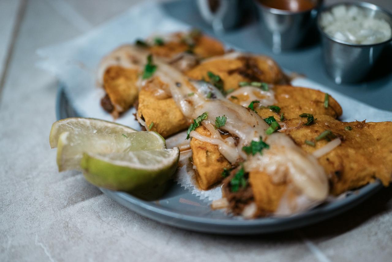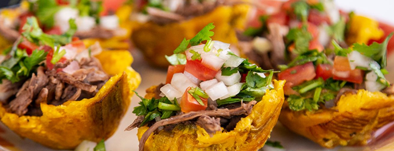 Deliciosa orden de patacones rellenos de frijol molido, pico de gallo y relleno a escoger.