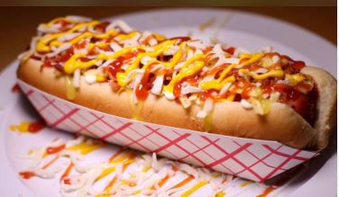 Delicioso perro caliente, pan de perro, salchicha, salsas especiales acompañado con papas.