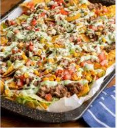 Deliciosos nachos deliciosos nachos, tortillas de maíz, carne mechada, frijoles molidos, pico de gallo, salsa de tomate, salsa de queso cheddar.