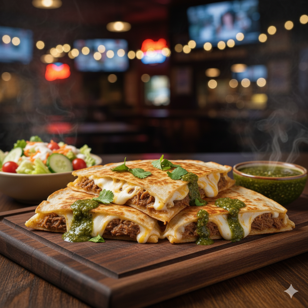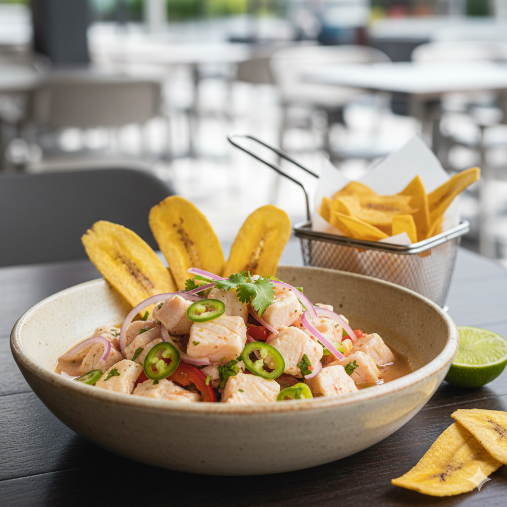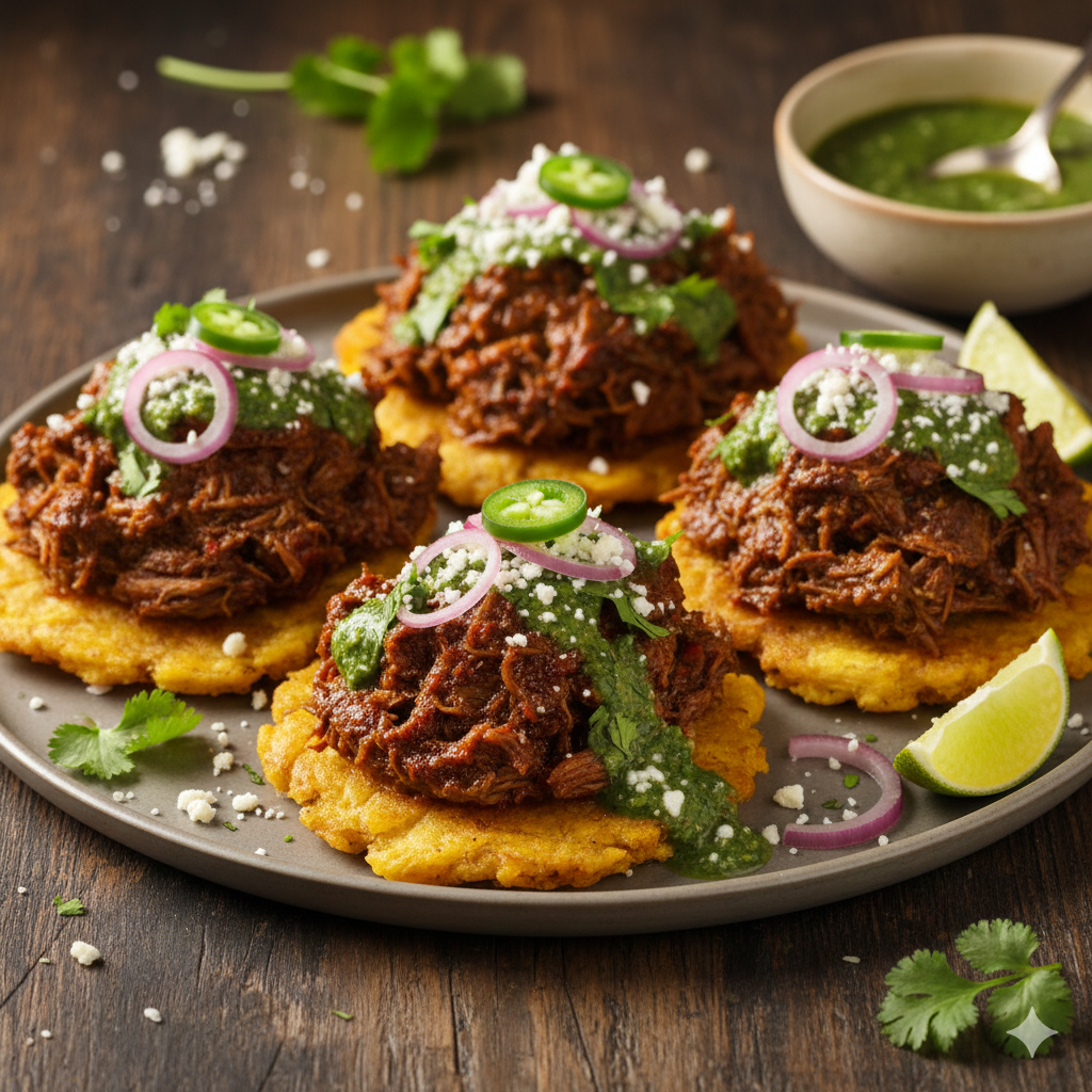 Salteado de cebolla y chile dulce, tortillas chips, chimichurri.