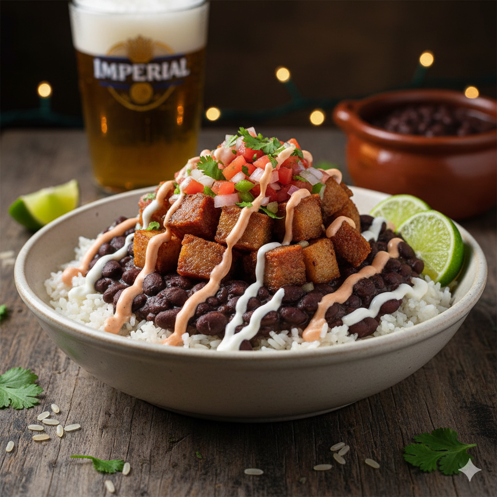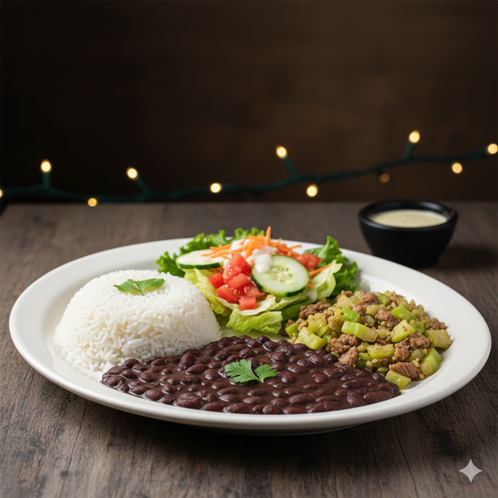 Arroz, frijoles, picadillo, ensalada (lechuga, tomate, pepino, zanahoria, aderezo).