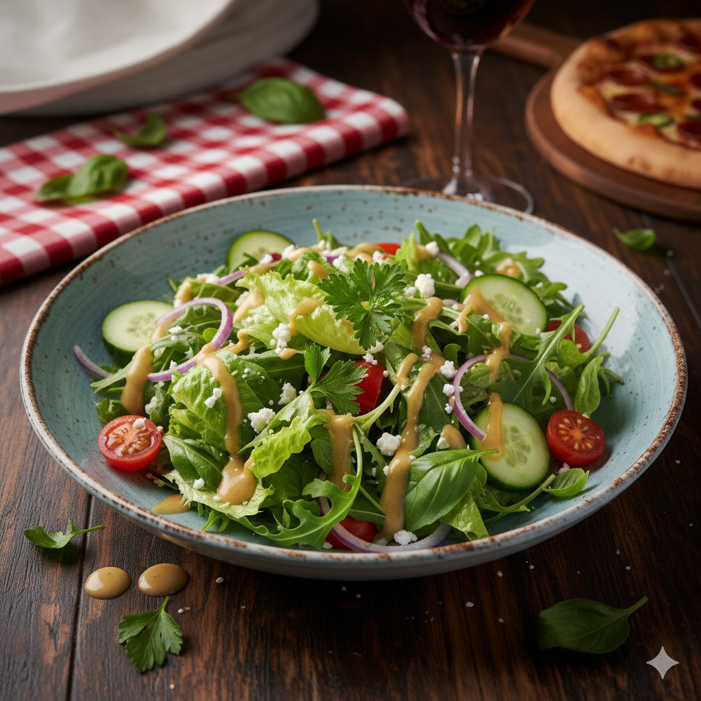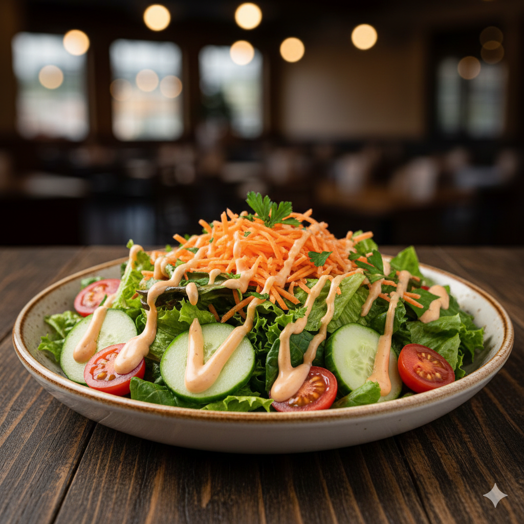 Ensalada (lechuga, tomate, pepino, zanahoria, aderezo).