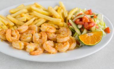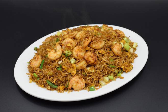 Una porción individual de arroz con camarones preparado con arroz blanco, camarones frescos, mezcla de especias y condimentos tradicionales que realzan su sabor.