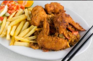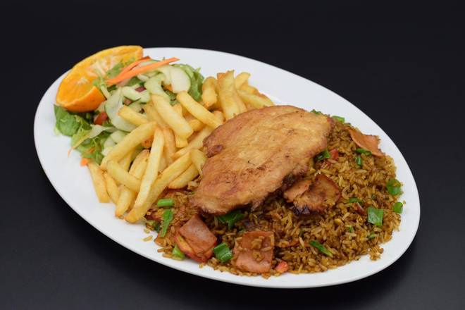 1 Porción personal de arroz cantonés preparado con cebollín, pollo, jamón y lechón, acompañado de 4 alitas de pollo. Incluye ensalada fresca del día y papas fritas .