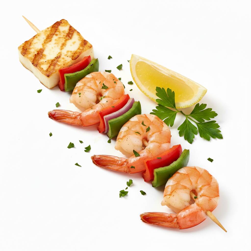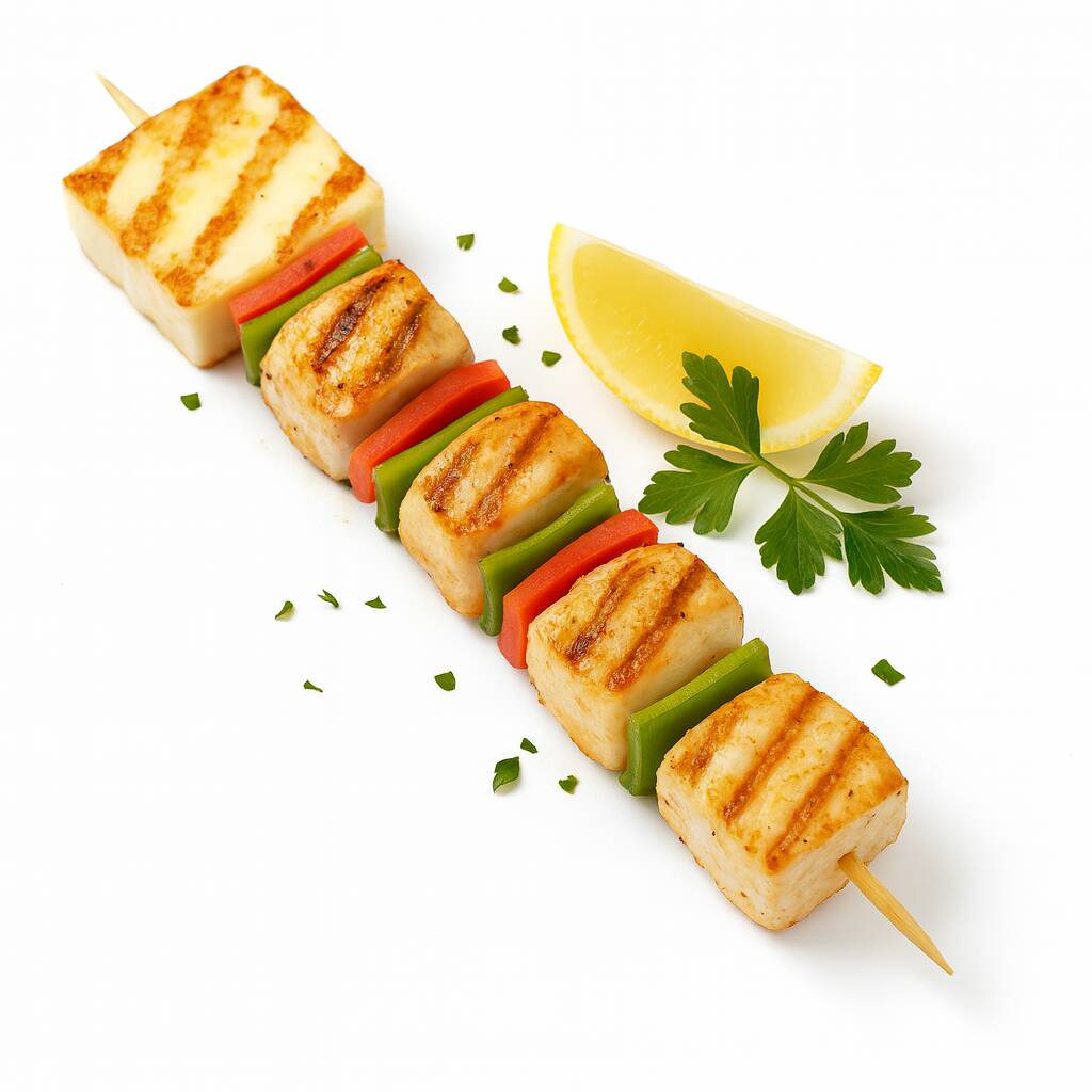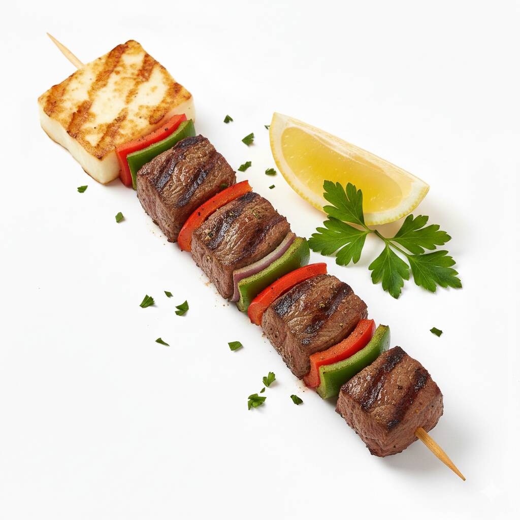 Ricas brochetas con chile dulce, cebolla y queso derretido, más ensalada aparte!
