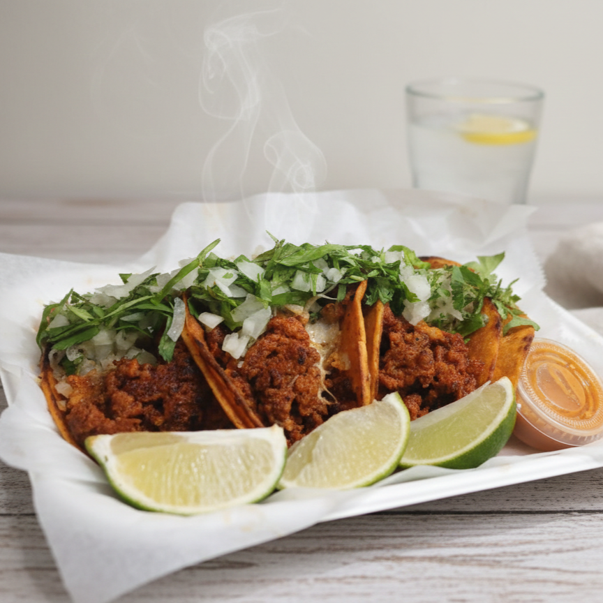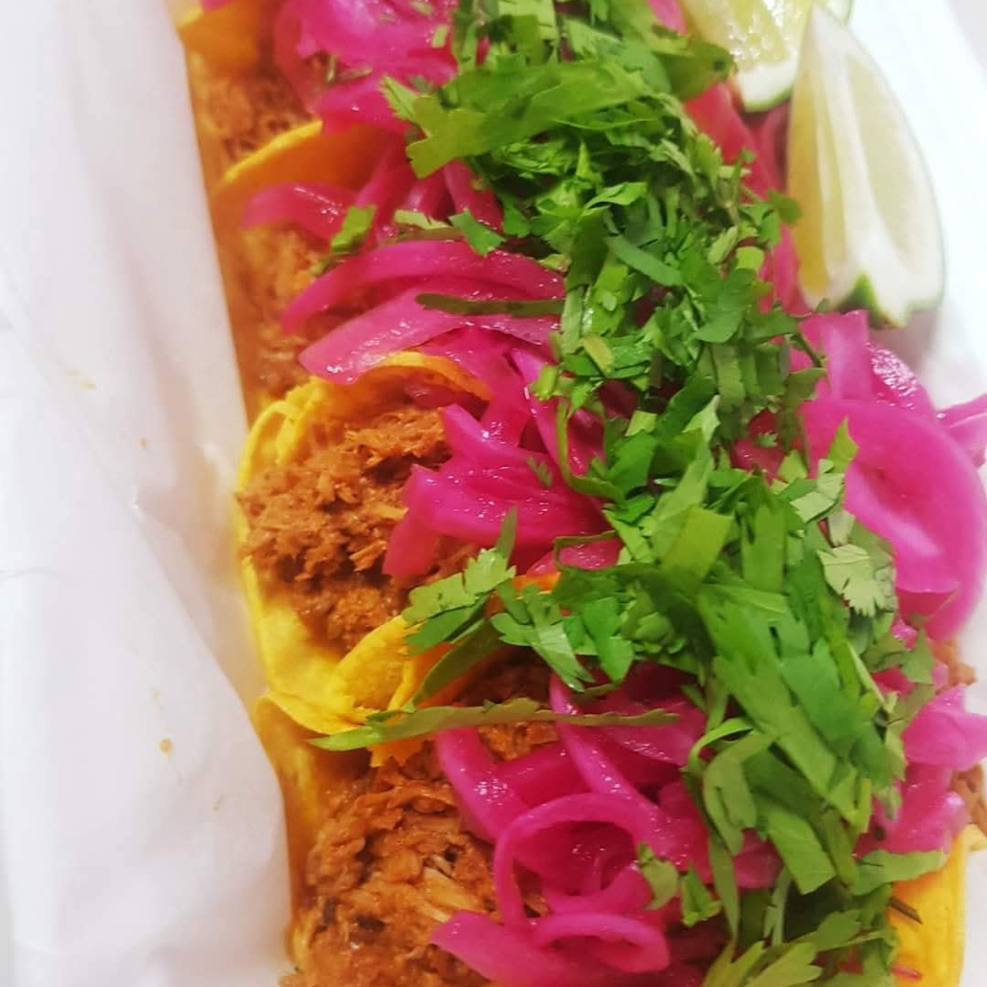 Acompañado de cebolla morada encurtida, cilantro, limón y chile de la casa.