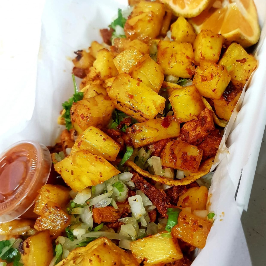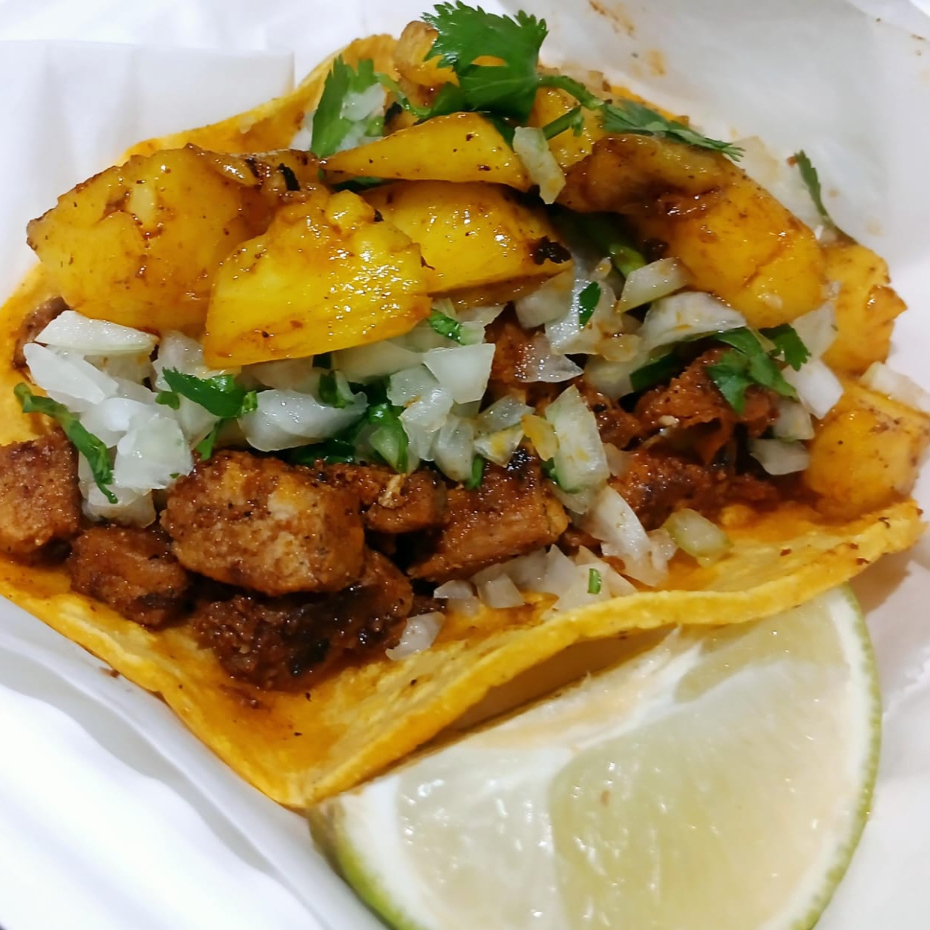 Acompañado de cebolla, culantro, limón, piña y chile de la casa.