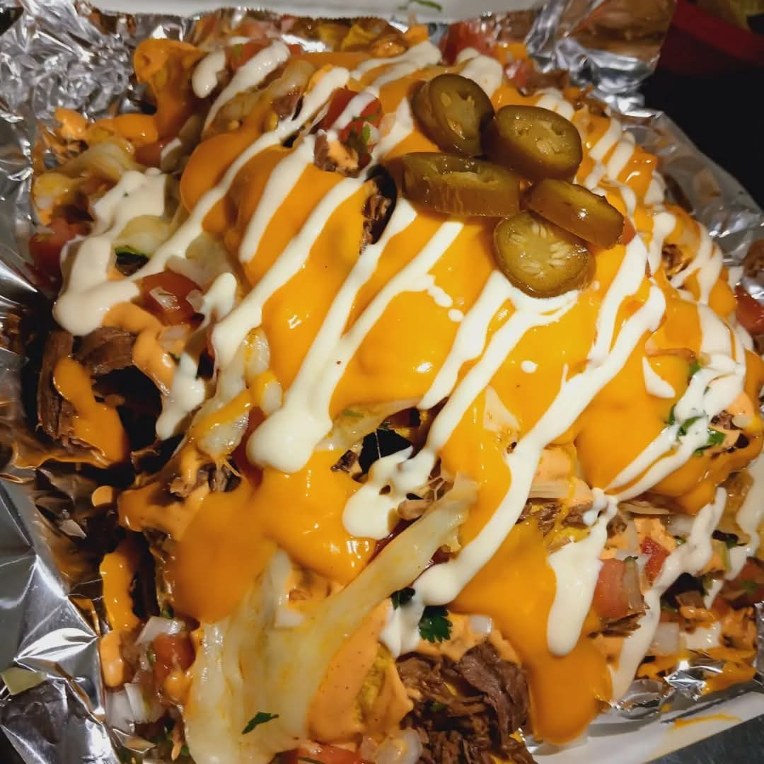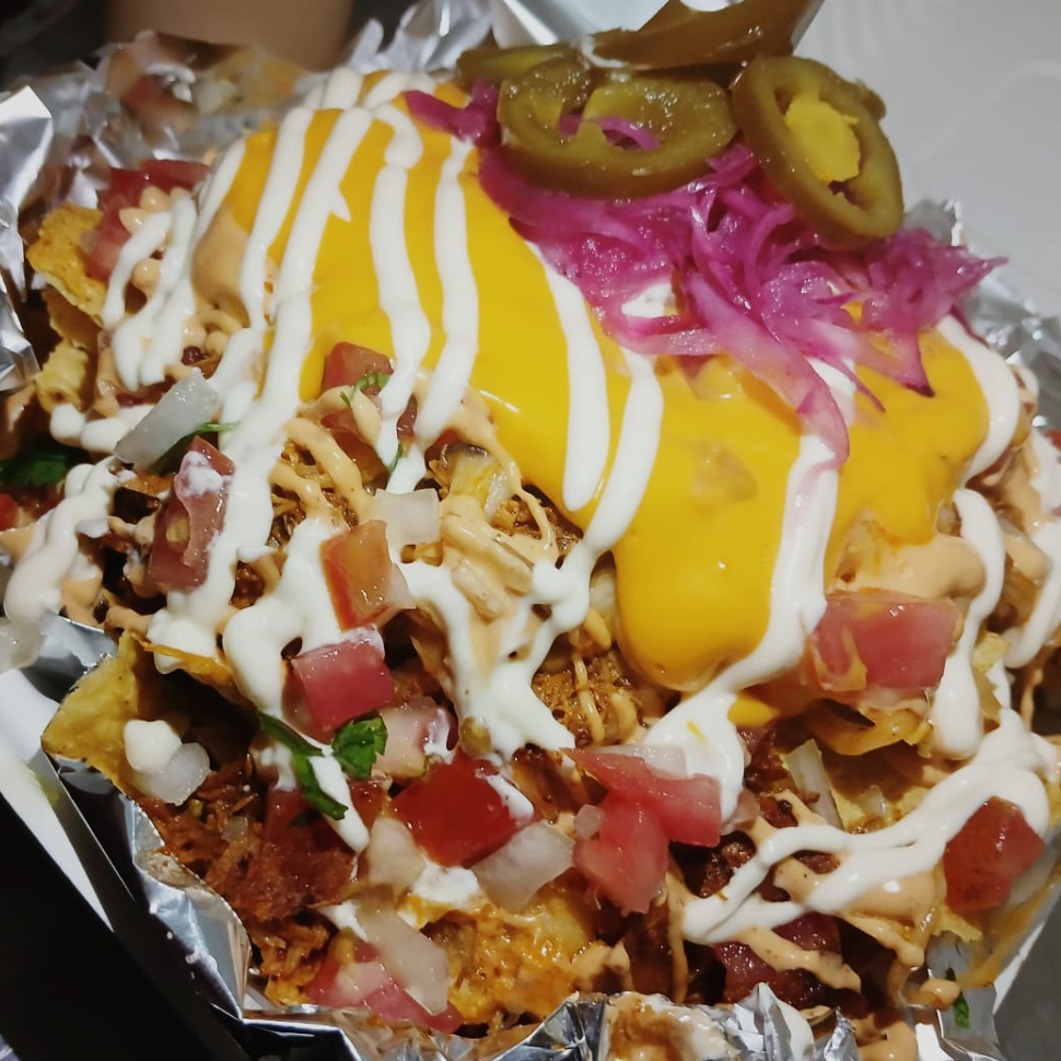 Carne de birria, pico de gallo, salsa chipotle, guacamole y natilla.