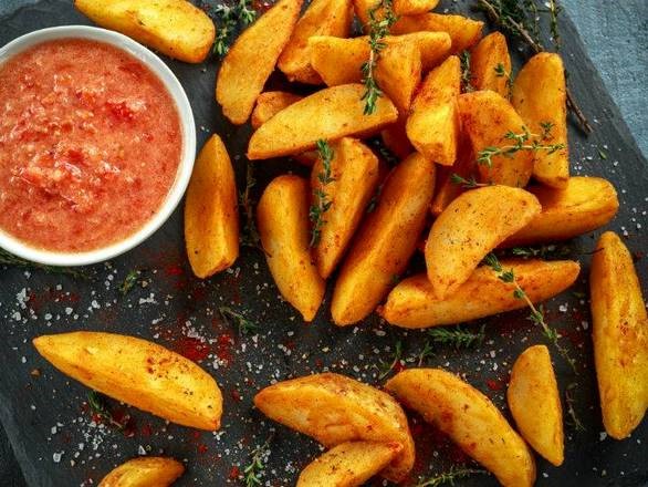 Papas cortadas en gajos, sazonadas con sal, perejil y un toque de parmesano. Crujientes por fuera y suaves por dentro. Acompañadas de su salsa favorita.