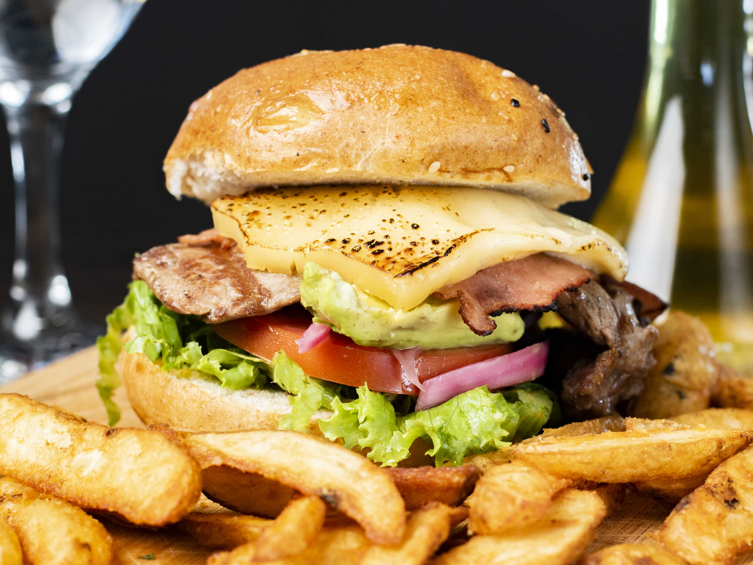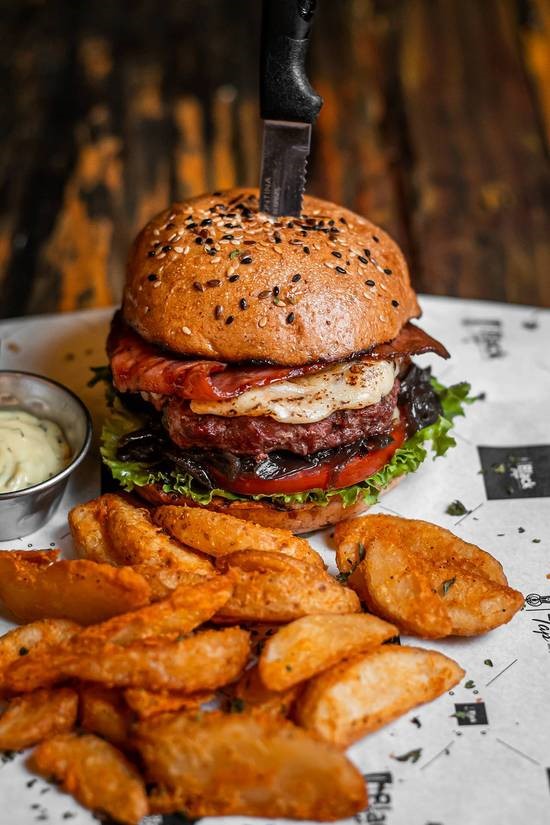 Exquisita hamburguesa con un delicioso corte de vacío a la parrilla, queso mozzarella, cebolla caramelizada, lechuga y tomate en nuestro pan artesanal acompañado de papas fritas.