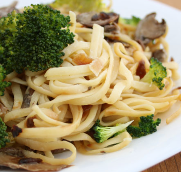 Pasta salteada con mantequilla, brócoli, champiñones y almendras, bañada con salsa Alfredo.