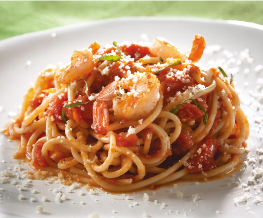 Pasta servida con camarones a la parrilla bañada en salsa napolitana preparada a base de tomates frescos y albahaca.