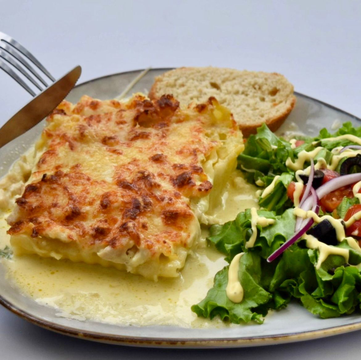 Lasaña preparada al horno con salsa blanca, pechuga de pollo, queso mozzarella acompañada con ensalada de lechuga.