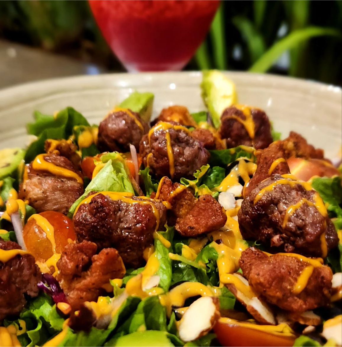 Aceitunas negras, manzana, almendras, cebolla morada, tomate cherry, maíz dulce, ajonjolí y aderezo a elección.