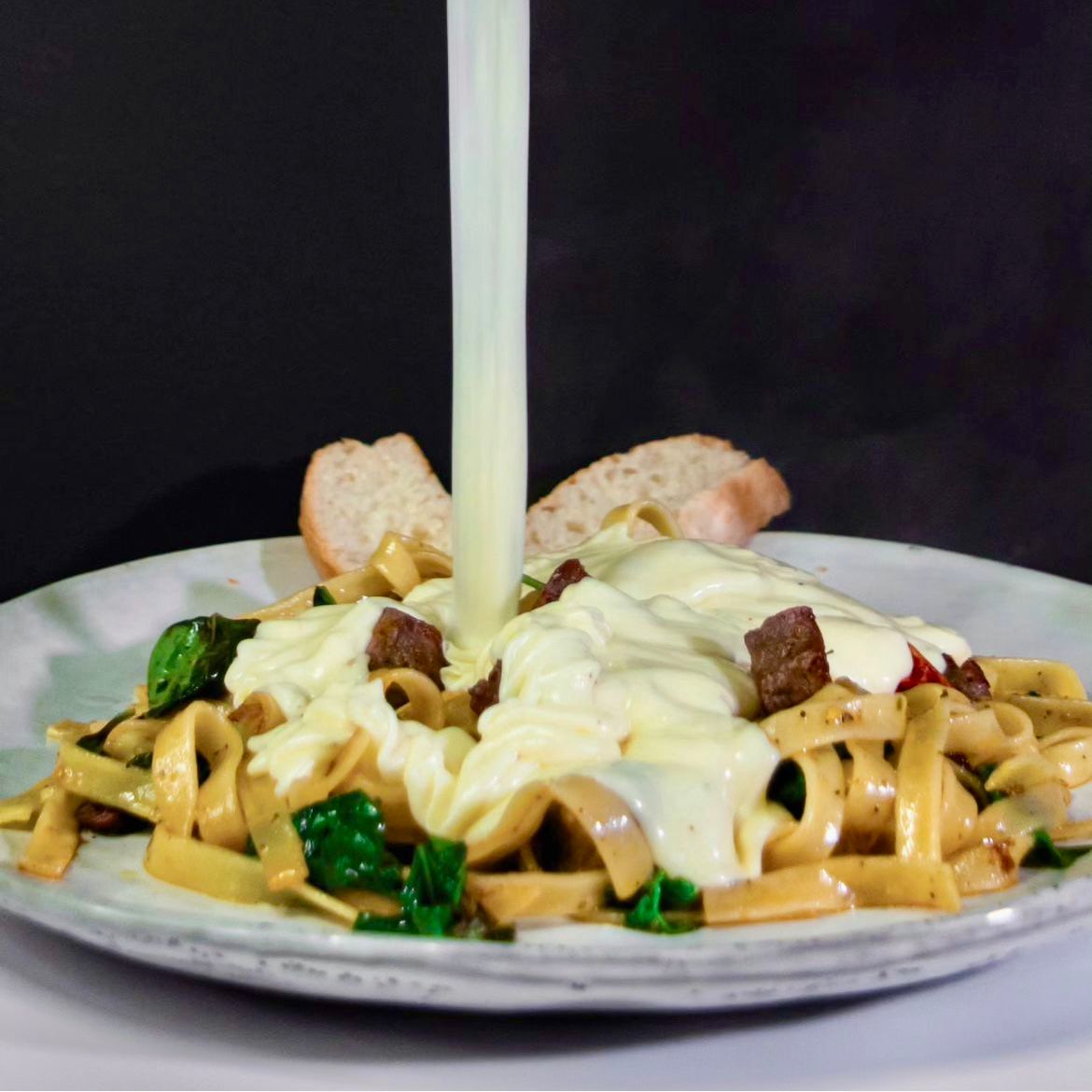 Pasta servida con nuestra salsa Alfredo preparada a base de crema de leche, parmesano y mozzarella servida con pollo a la parrilla y albahaca.