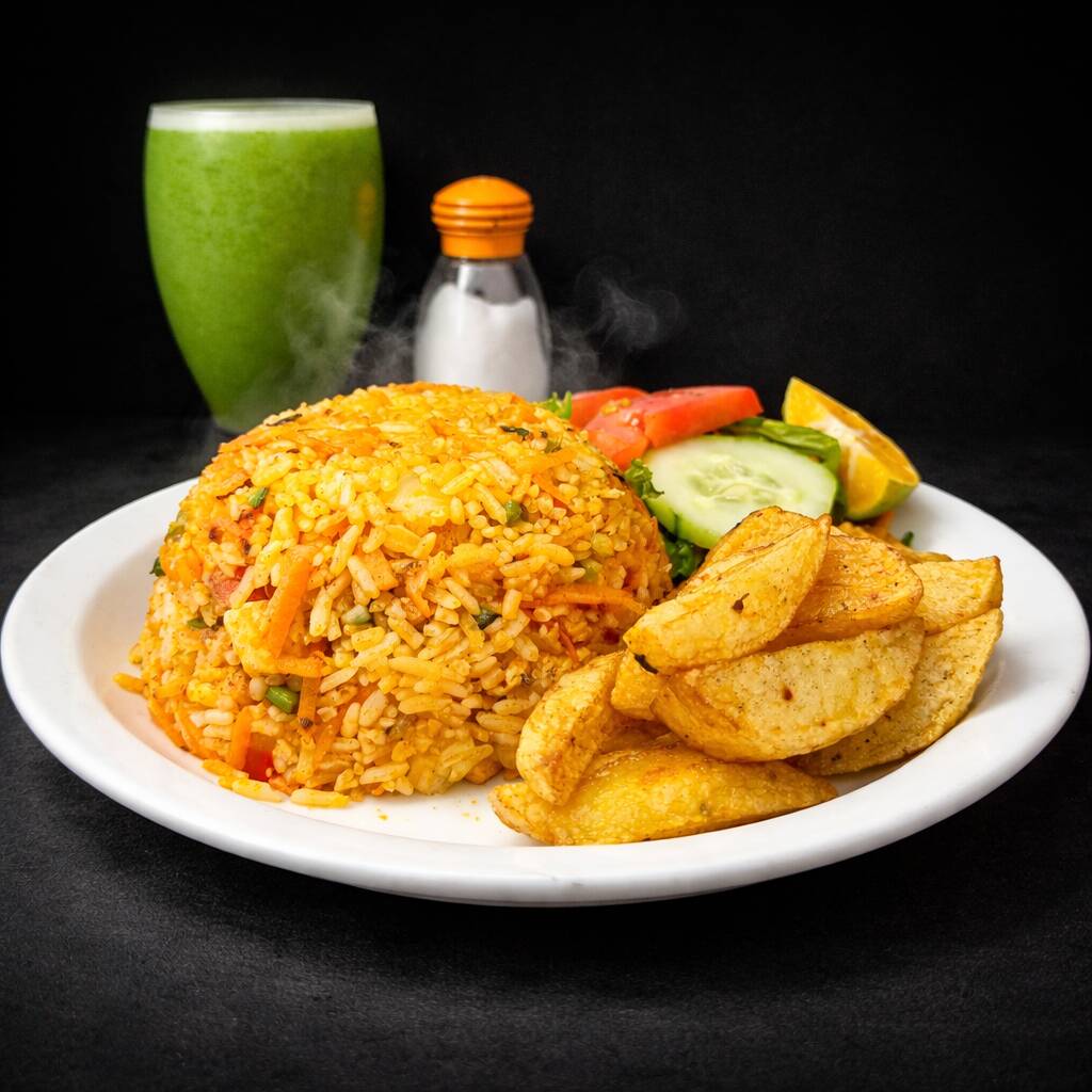 Arroz mixto (res y pollo), acompañado de papas fritas, ensalada verde y fresco natural.