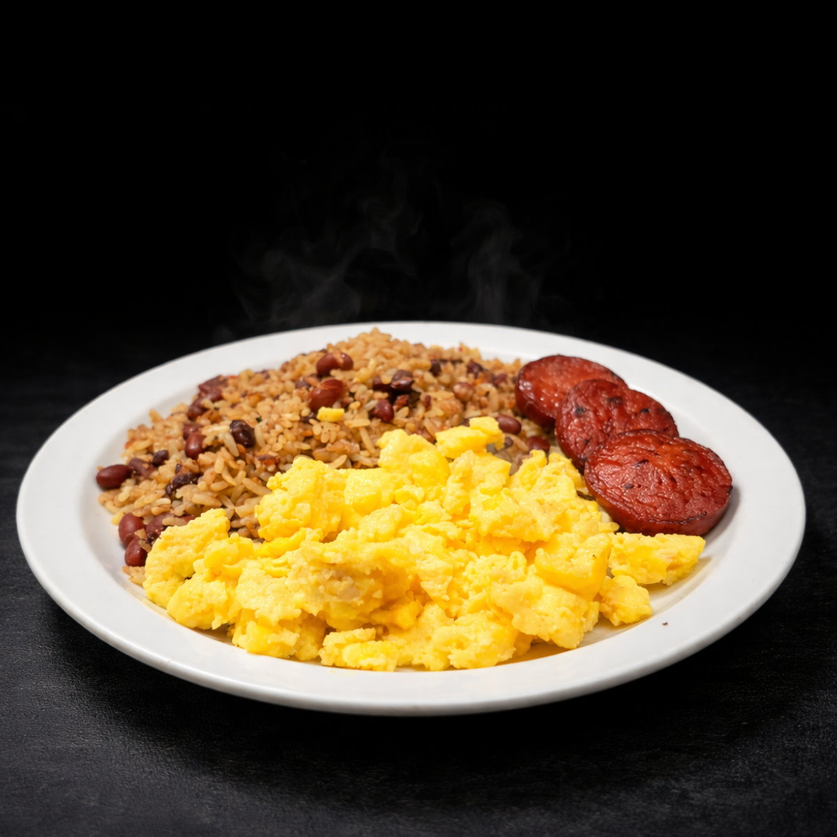 Combo con precio especial. Gallo pinto, huevo al gusto, plátano maduro, salchichón y una bebida a elegir.