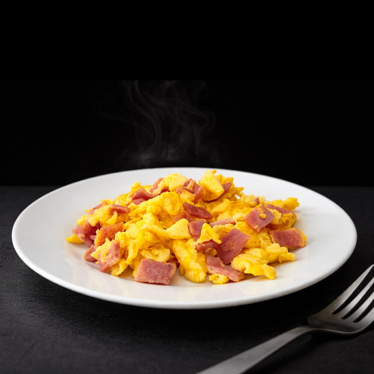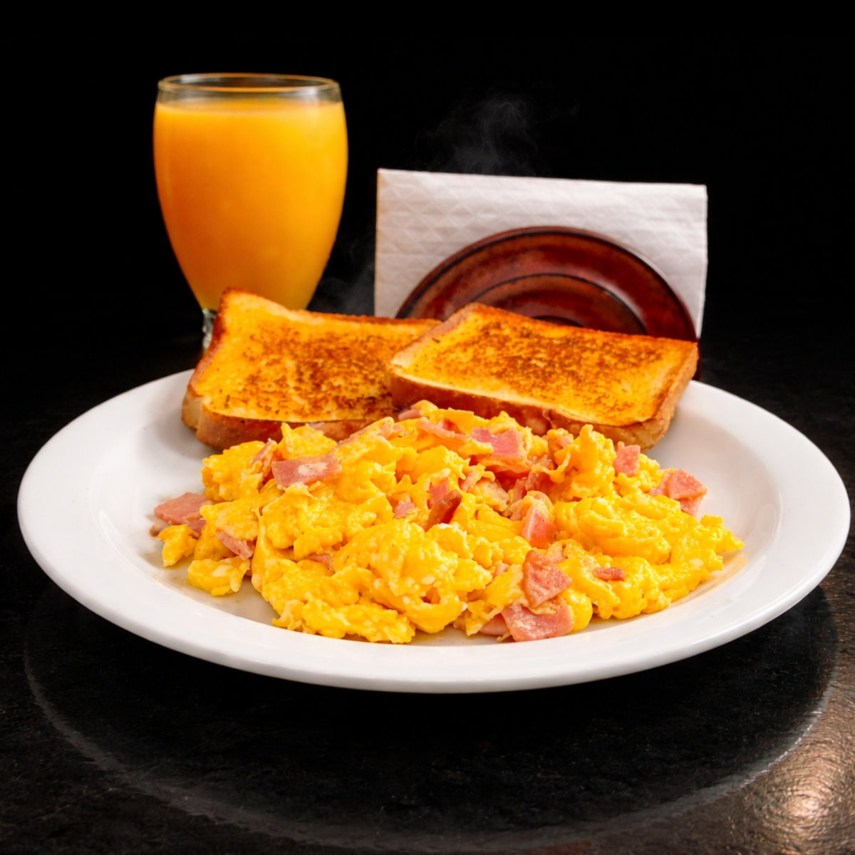 Huevos con jamón, acompañados de tostadas y café o jugo de naranja.