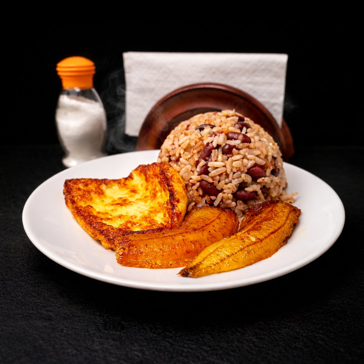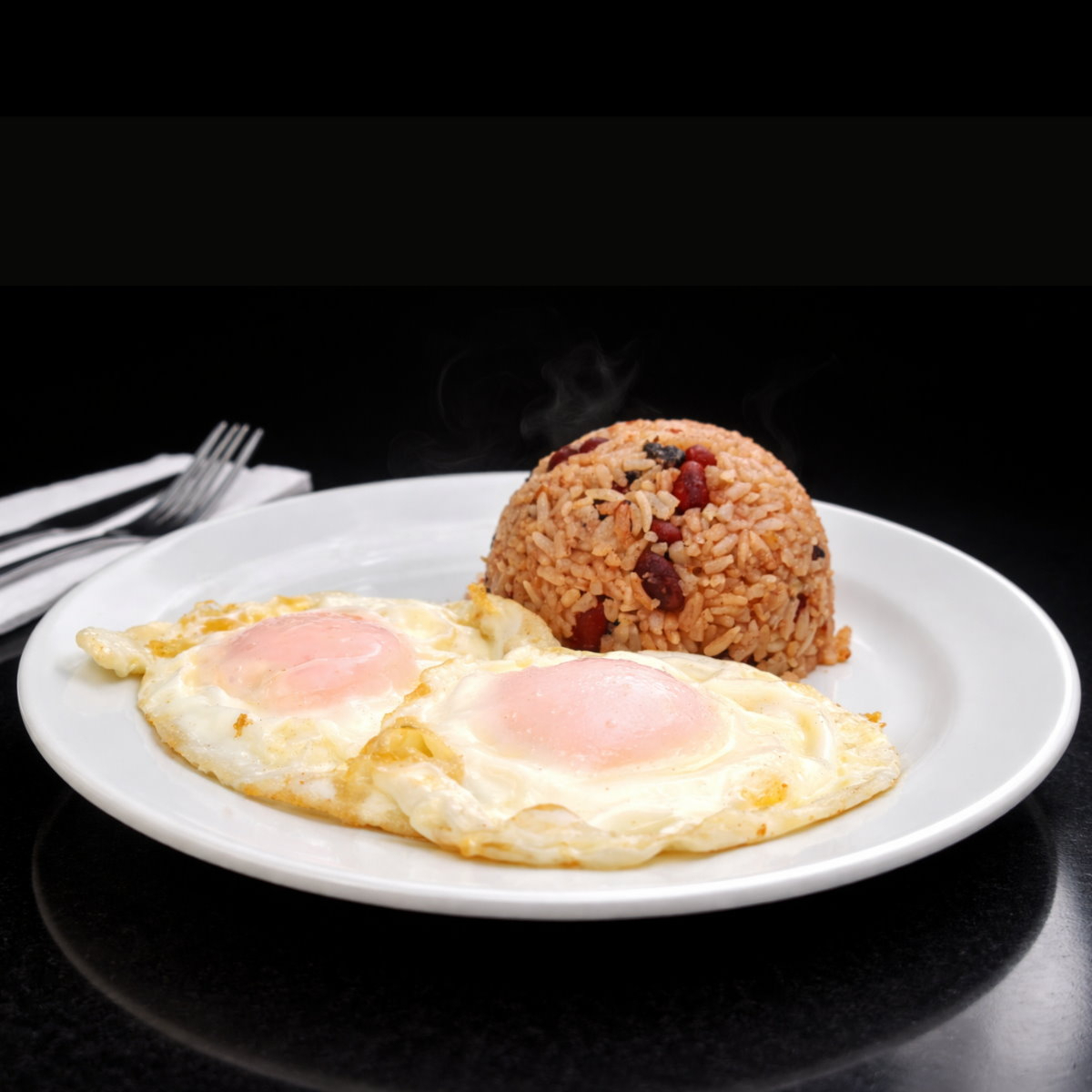 Escoge tu preparación -Gallo pinto, acompañado de huevo a elección, 2 plátano maduro y queso frito. Platillo individual