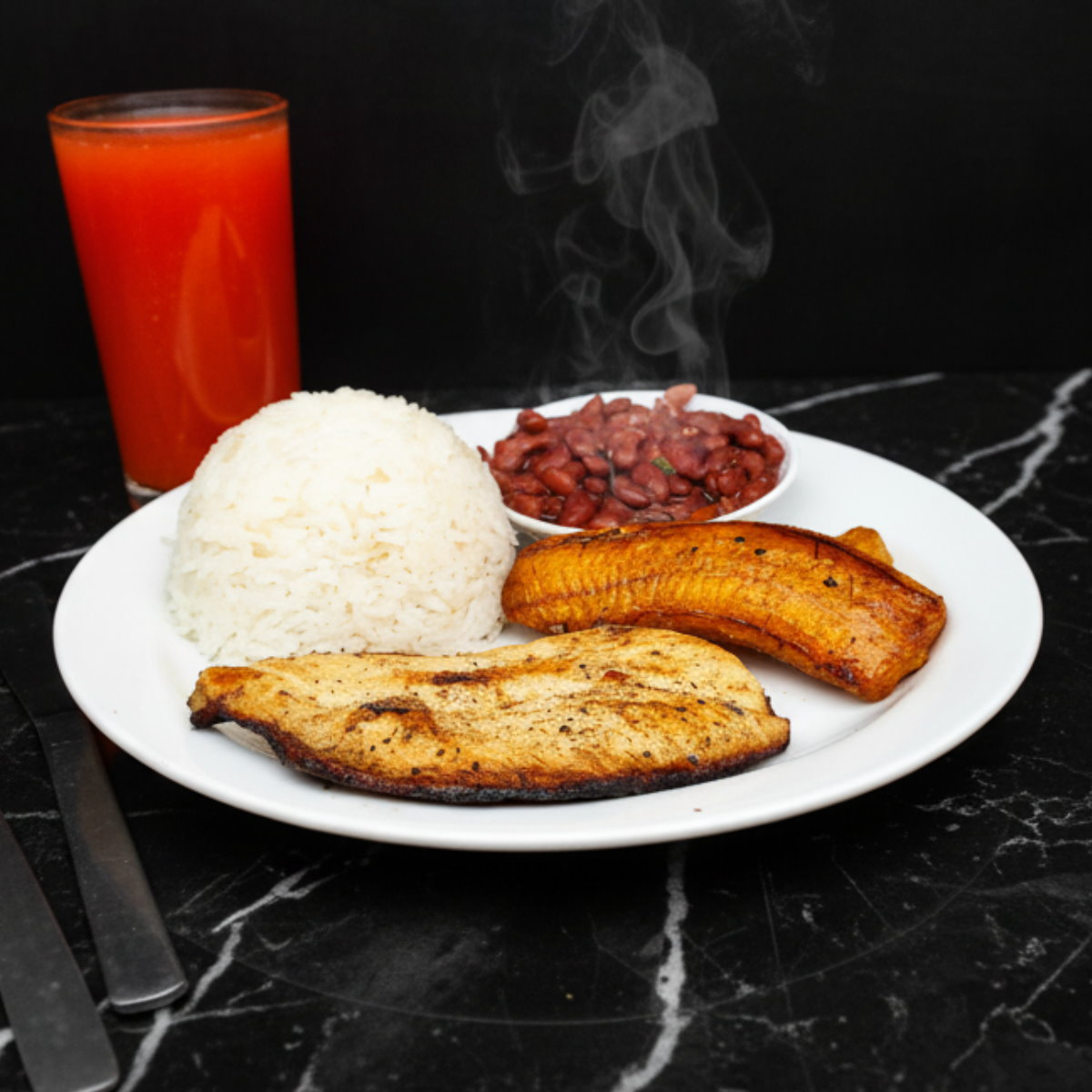 Arroz, frijoles, picadillo, plátano maduro, ensalada verde, fresco natural y la carne de su elección. Platillo personal.