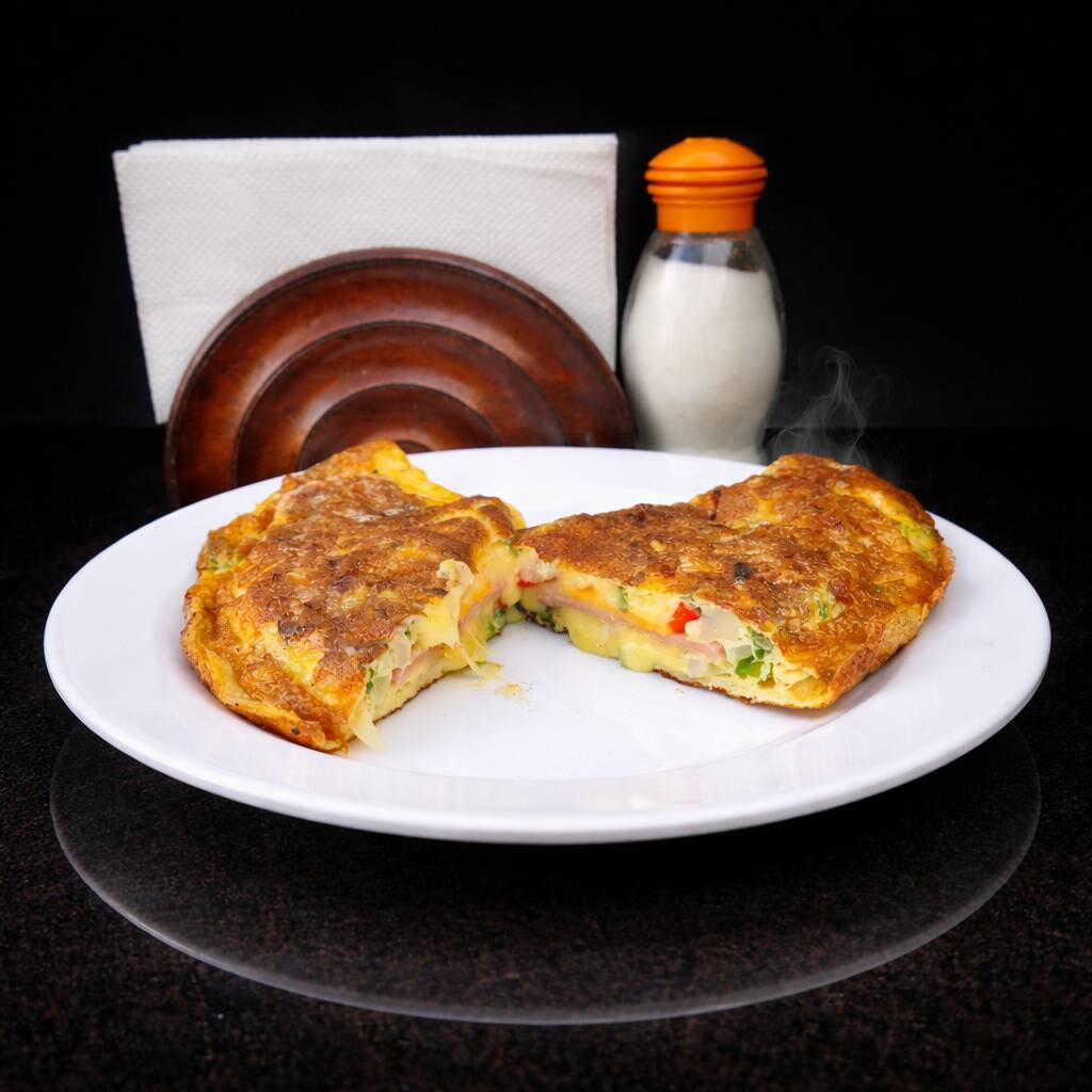 Omelet con jamón, queso amarillo, queso mozzarella y olores.