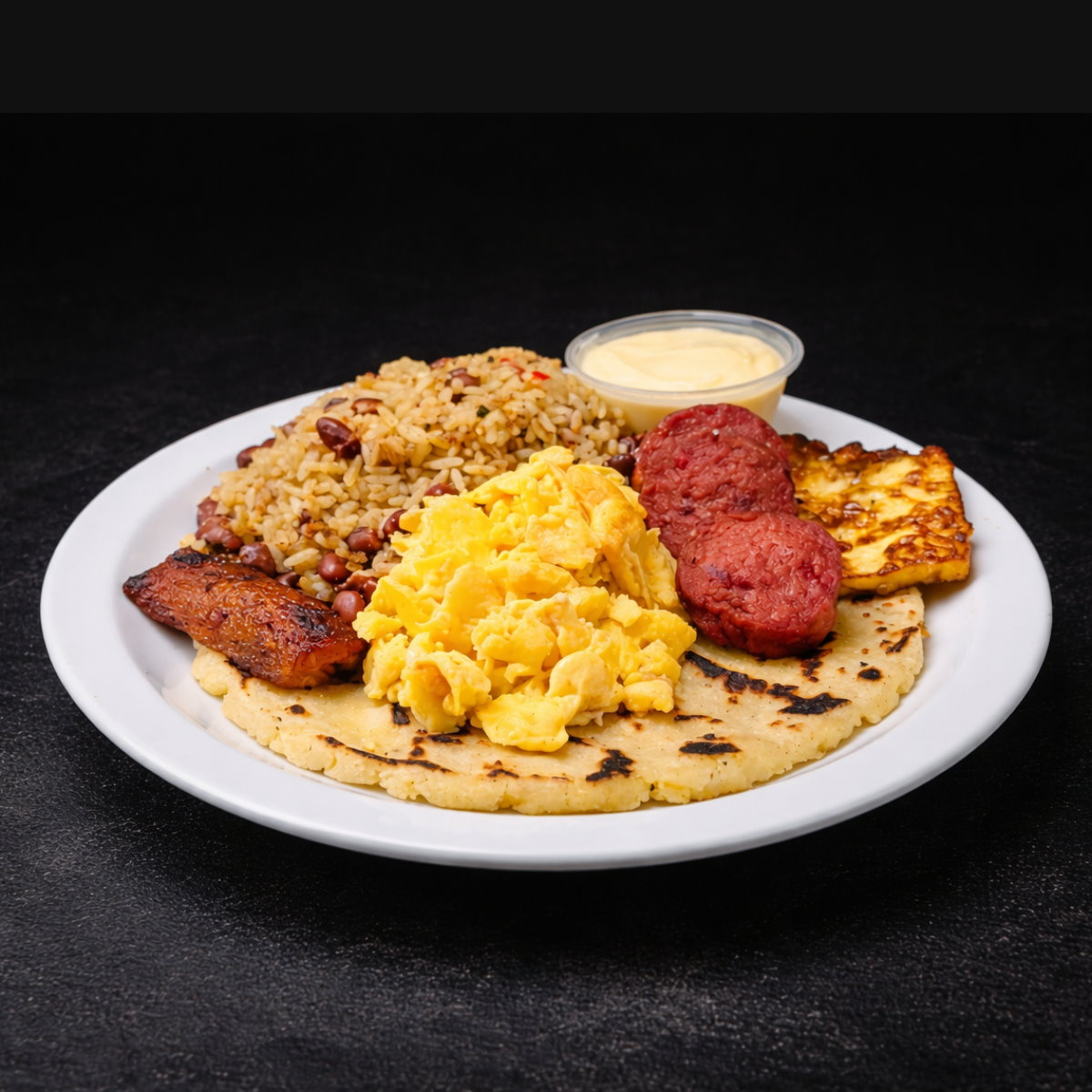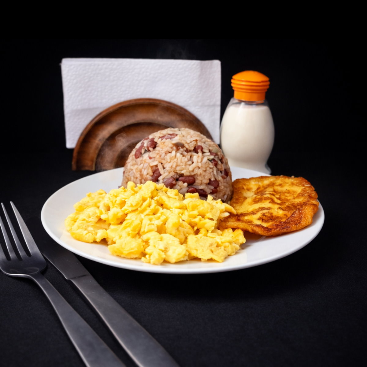 Gallo pinto, acompañado de huevo a elección, 1 plátano maduro, salchichón, queso frito, natilla y 1 tortilla. Platillo personal.