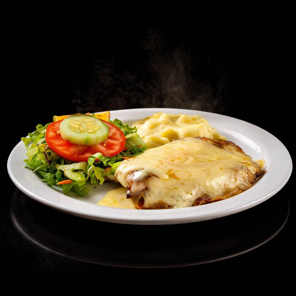 Filete de pollo terminado de dorar en queso mozzarella, acompañado de ensalada, puré de papa y fresco natural.