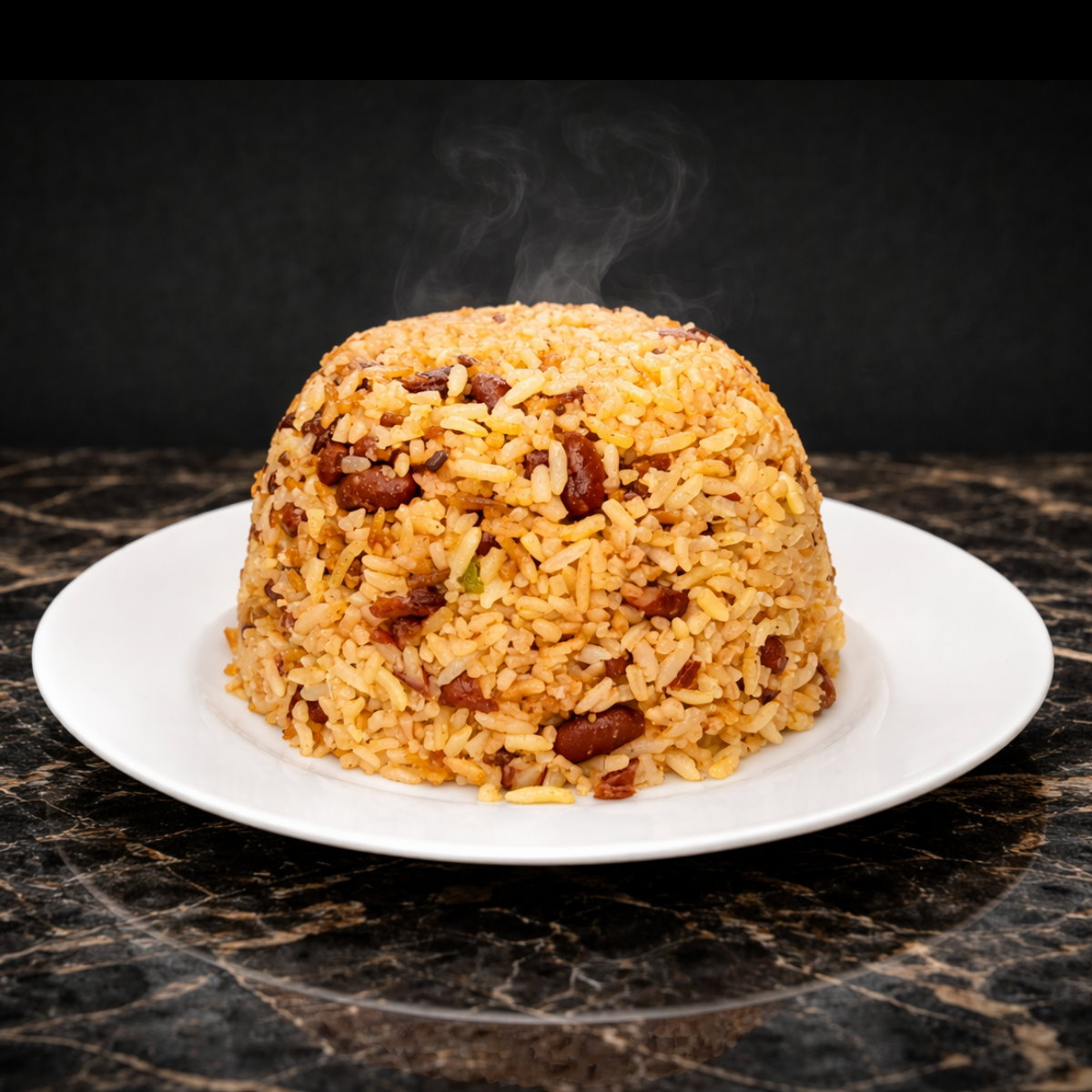Arroz, frijoles, plátano maduro, fresco natural y la carne de su elección.