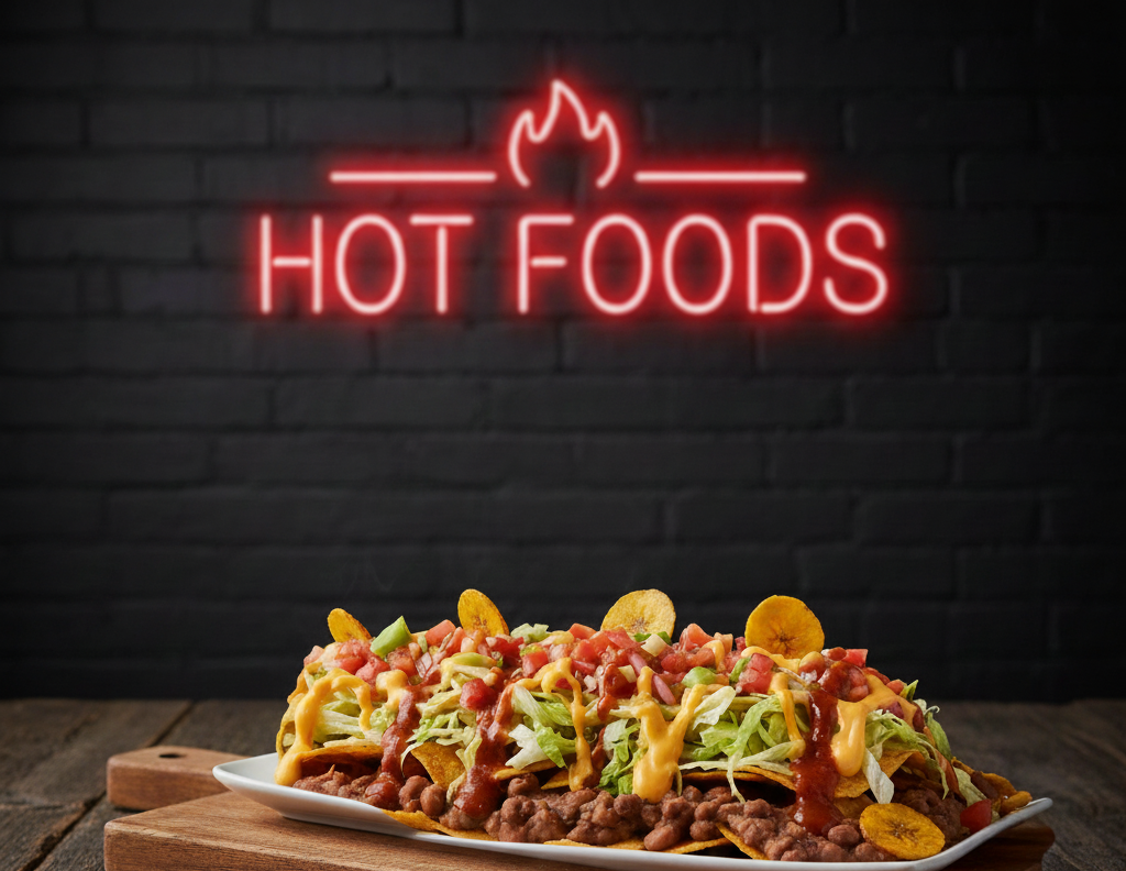 Únicos y deliciosos nachos, base de frijol, lechuga fresca, pico de gallo, salsa de queso, salsa brazas, tajada de patacón.
