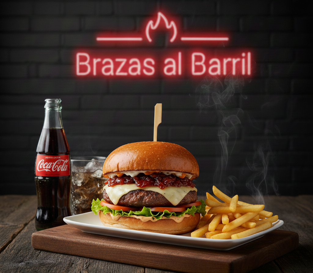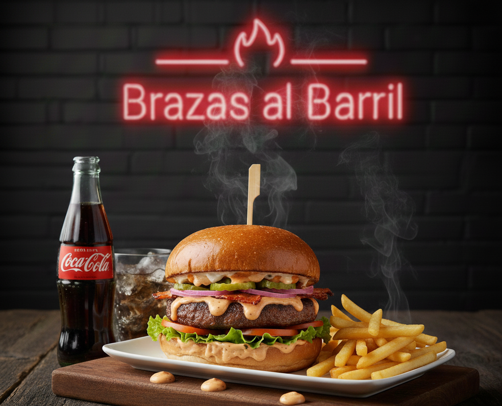Hamburguesa con doble torta de res (90 gramos cada una) Salsa Brazas, Pan artesanal, cebolla morada, tocineta crocante, pepinillos con papas a la francesa más Coca Cola de 250 ml.