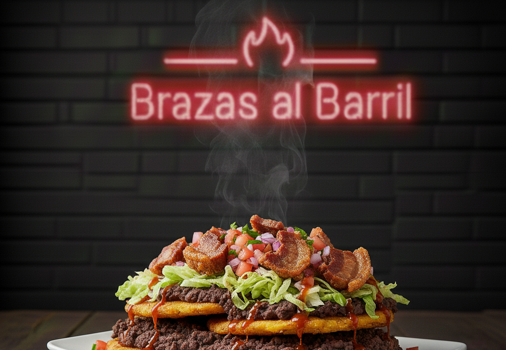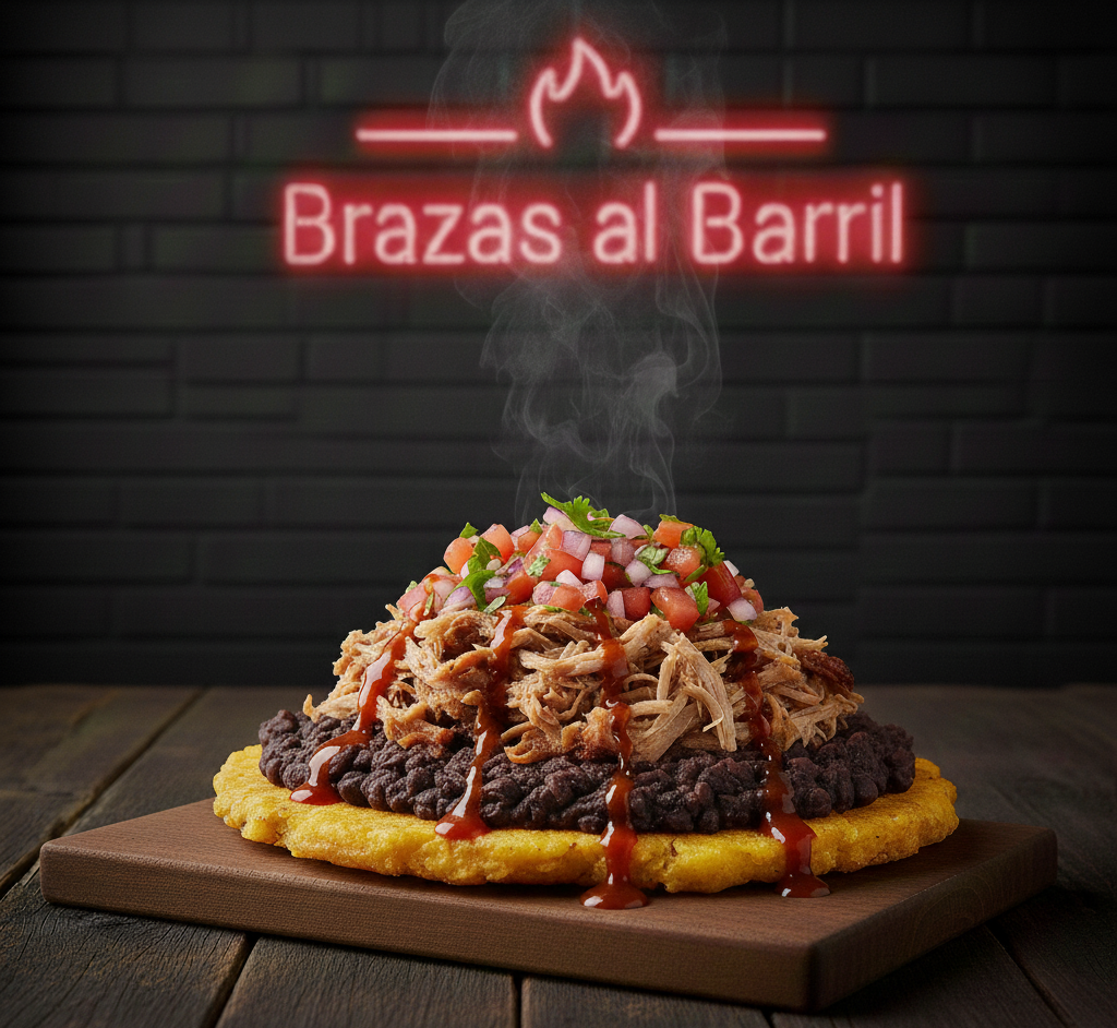Patacón relleno, base de frijoles, cerdo mechado ahumado, pico de gallo y salsa brazas.