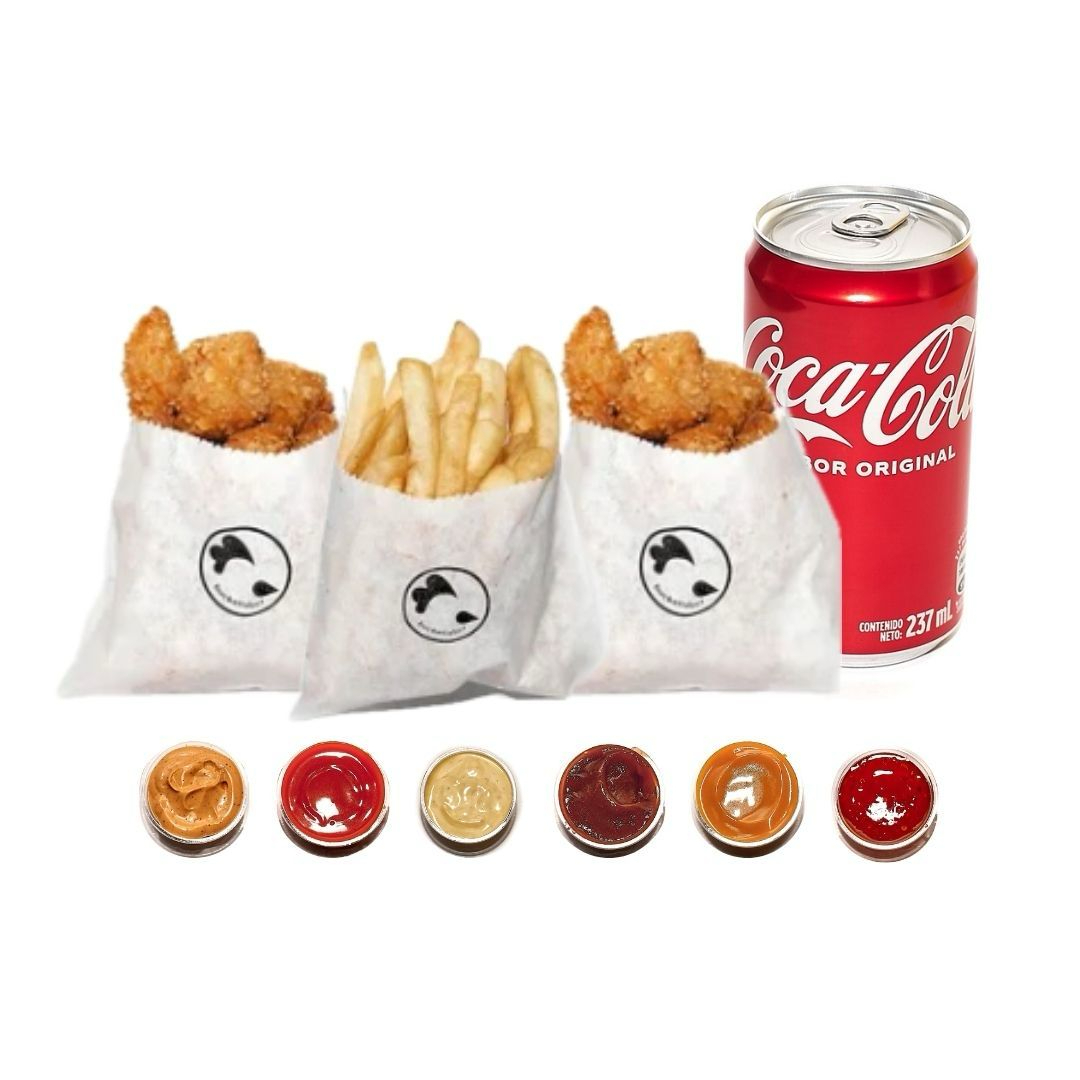1 snack de pollo, 1 snack de papas, 1 salsa especial y una gaseosa 250ml.
