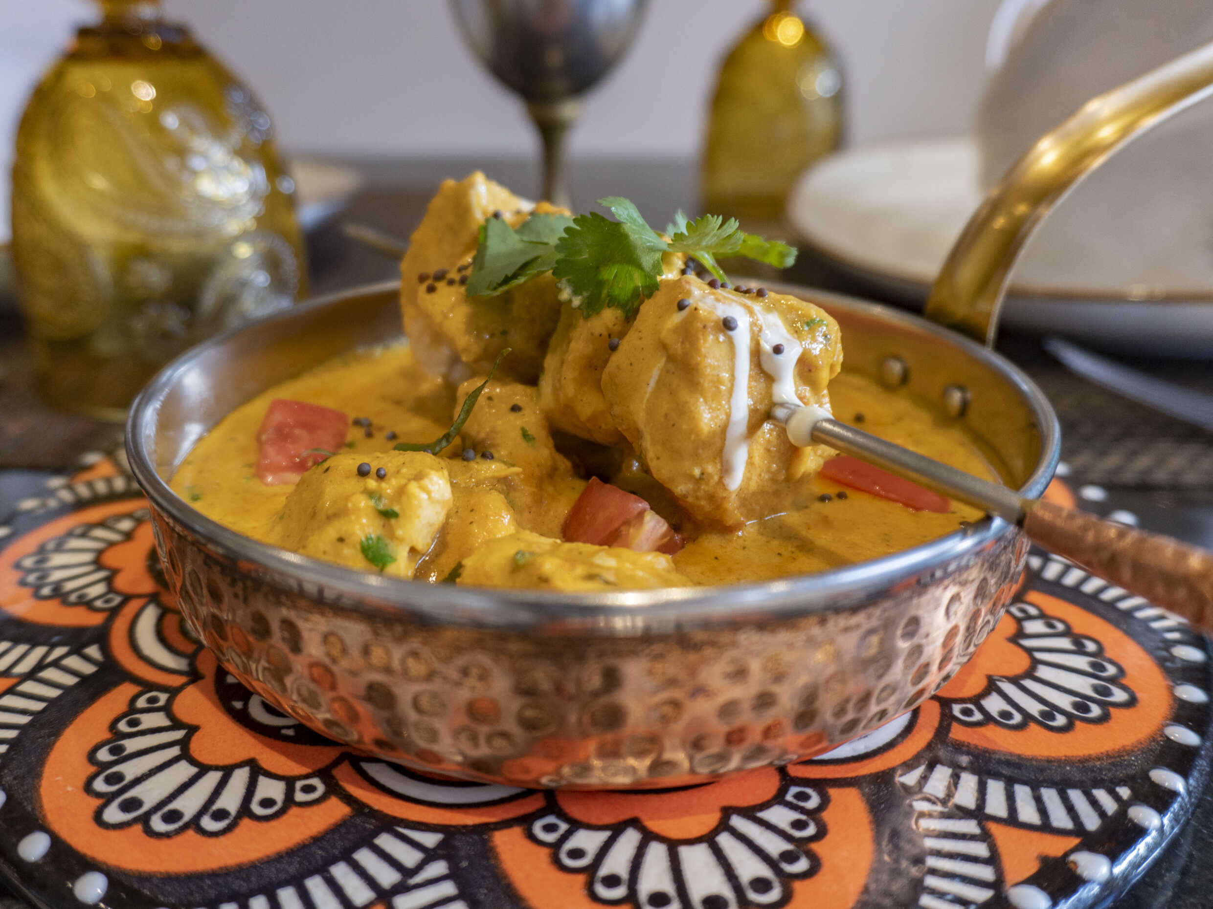 Chicken, coconut milk, ginger, turmeric, kafir lime leaves and garlic. Gratis arroz Jasmine.