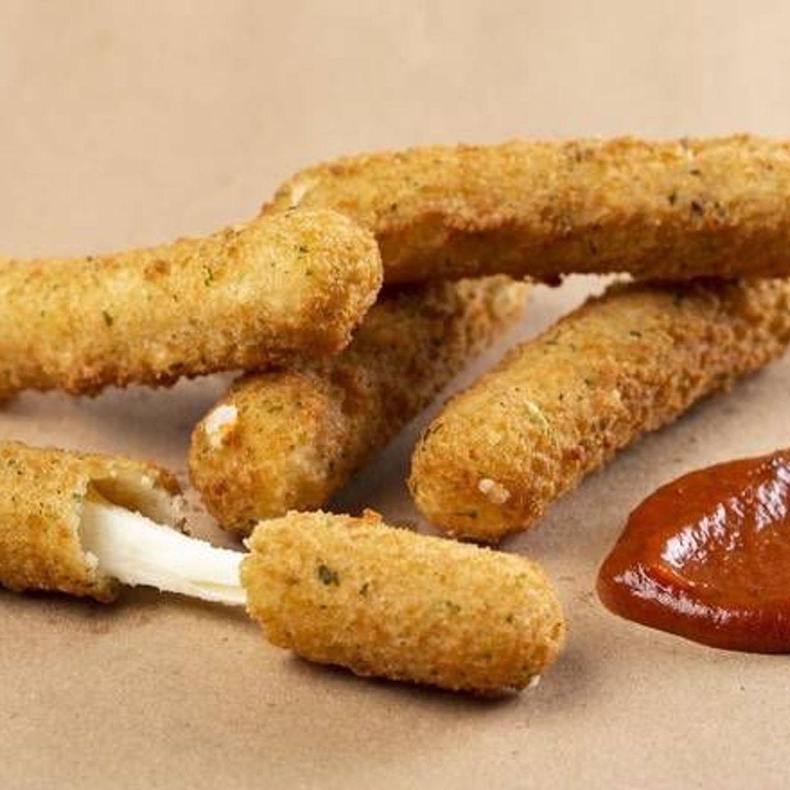 Palitos de queso, empanizados con hierbas y servidos con salsa marinara.