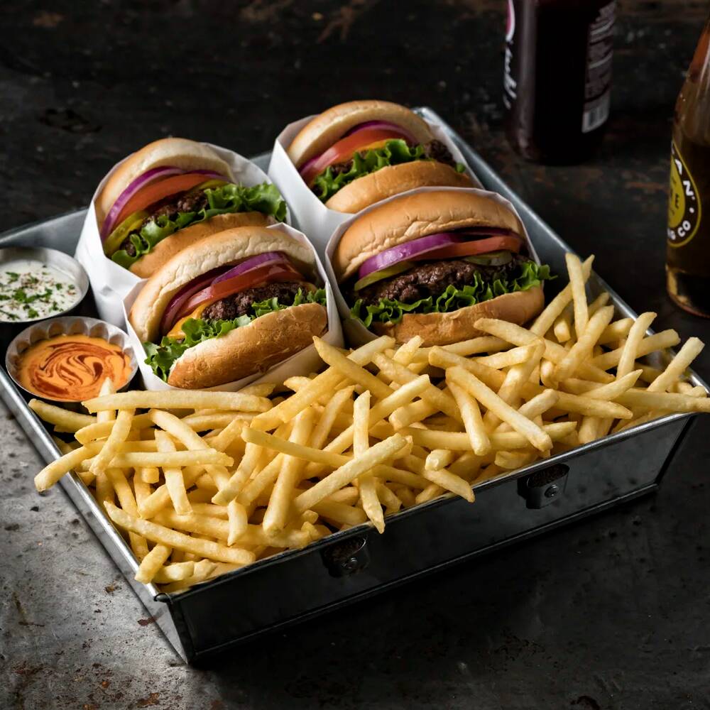 Mega hamburguesa artesanal*4 + Coca cola 250 ml*4 + Porción de Papas francesas*4