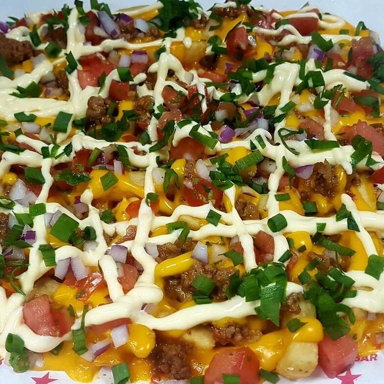 Papas a la francesa con tomate frijoles carne mechada mas lechuga con sus salsas de tomate mayonesa queso cheddar y mayonesa casera