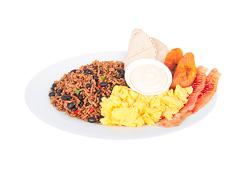 Desayuno deluxe a lo tico y a tu manera, acompañado de plátano maduro, tocino, natilla y tortillas.