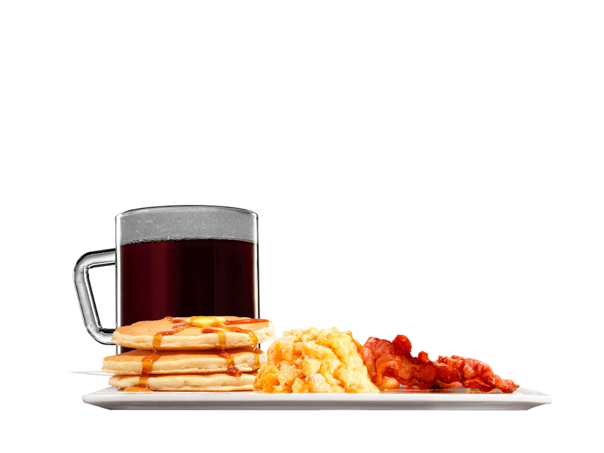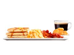 ¡Desayuno completo para reyes! Nuestros esponjosos pancakes acompañados de huevo y tocino.
