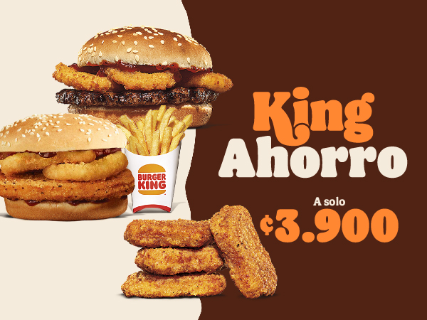 Nuestra BIG KING® lleva dos exquisitas tortas de carne a la parrilla, una rebanada de queso amarillo, lechuga fresca, cebolla crujiente, pepinillos y salsa especial, con tres rebanadas de pan suave con ajonjolí. ¡Pídela en COMBO con papas y una refrescante bebida!