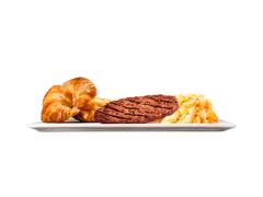 Una forma diferente de iniciar la mañana. Huevo revuelto y opción de salchicha a la parrilla con un pan de croissant.