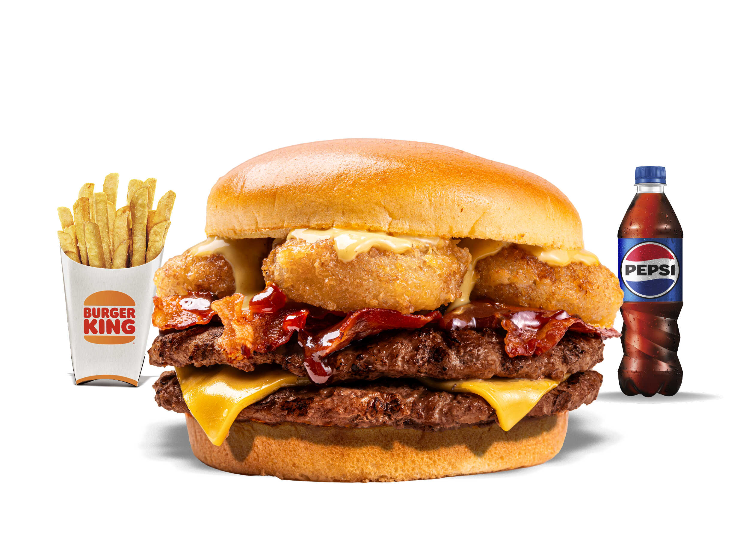 Combo de la nueva King con doble torta de carne 100% a la parrilla, con deliciosos aros de mozzarella y salsa de mostaza miel.