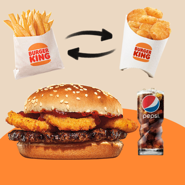 Disfruta de tu hambuguesa + refresco favoritos y selecciona entre papas fritas o hash brown.