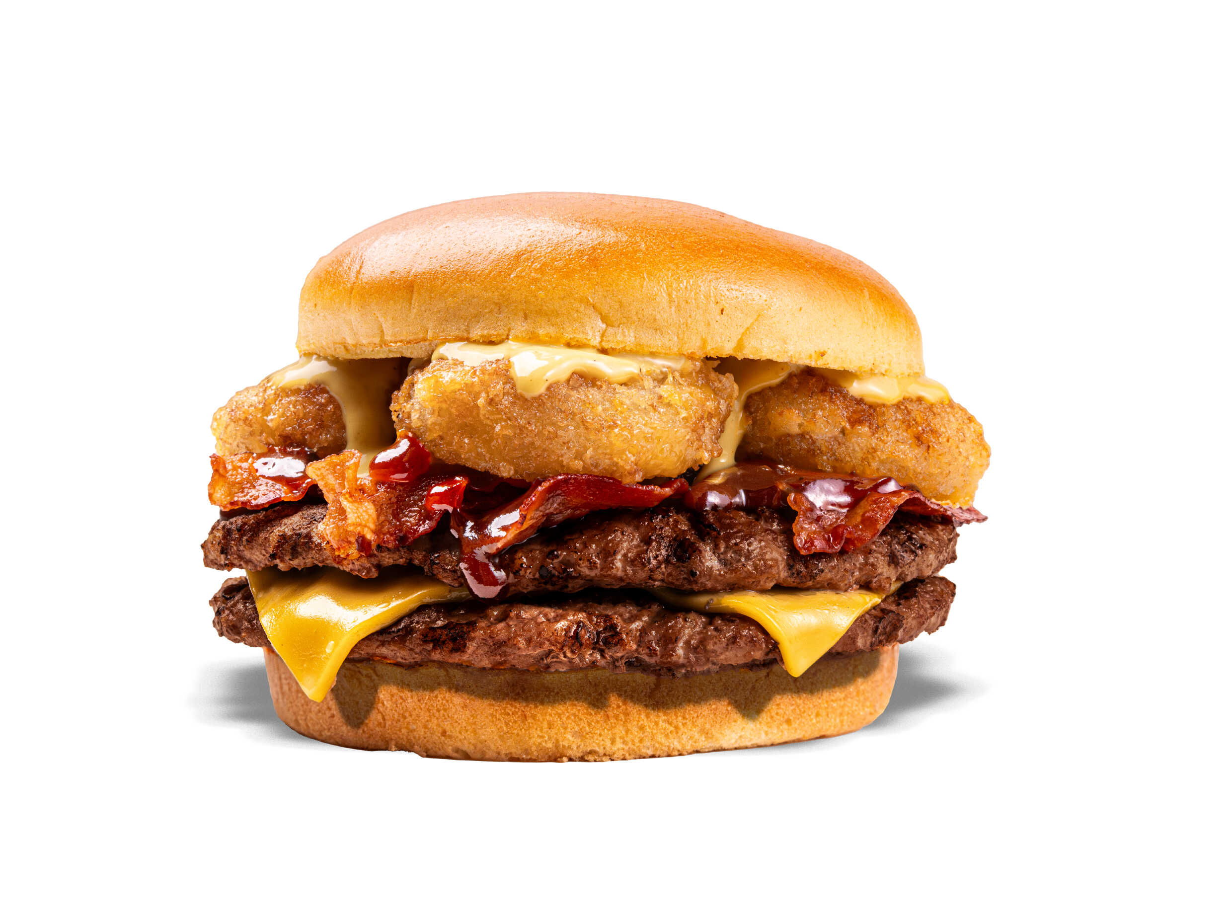 Jugosa carne a la parrilla con aros de cebolla crujientes, tocino ahumado, queso derretido y salsa BBQ, todo en un suave pan con ajonjolí.